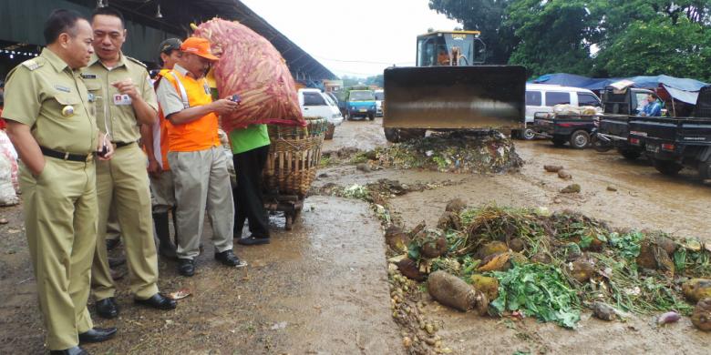 JAKARTA, KOMPAS.com - Wali Kota Jakarta Timur Bambang SW meninjau tempat pembuangan sampah sementara (TPS) di Pasar Induk Kramatjati, Jakarta Timur, Selasa (13/1/2015). Peninjauan itu terkait masalah sampah yang sempat tidak tertangani dengan baik, sehingga menggunung.