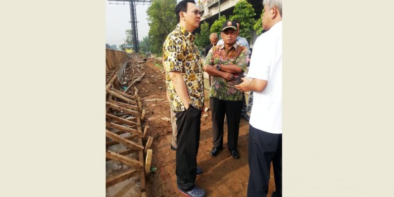 Gubernur DKI Jakarta Basuki Tjahaja Purnama akan meninjau tanggul Kali Sunter, Jakarta Utara, Kamis (12/2/2015). Tanggul ini pernah jebol akibat kontraktor Balai Besar Wilayah Sungai Ciliwung Cisadane (BBWSCC) yang langsung menjebol dinding tanggul untuk memasukkan alat berat. Menurut Basuki, kali ini kembali ada kesalahan dalam pengerjaan tanggul di Kali Sunter.