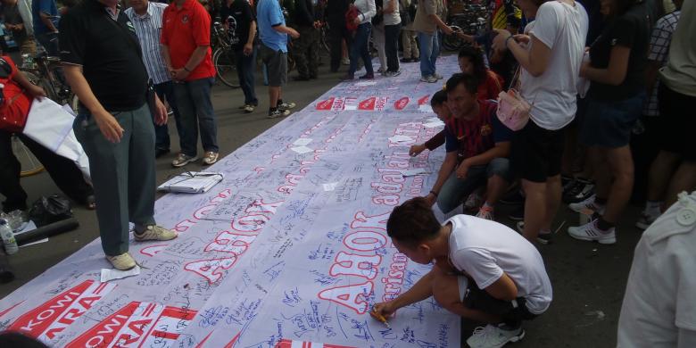 Tanda tangan dituliskan dengan spidol di atas kain panjang berwarna putih. Menurut Syafti, sejak pekan lalu hingga hari ini, sudah ada sekitar 40.000 tanda tangan yang terkumpul.