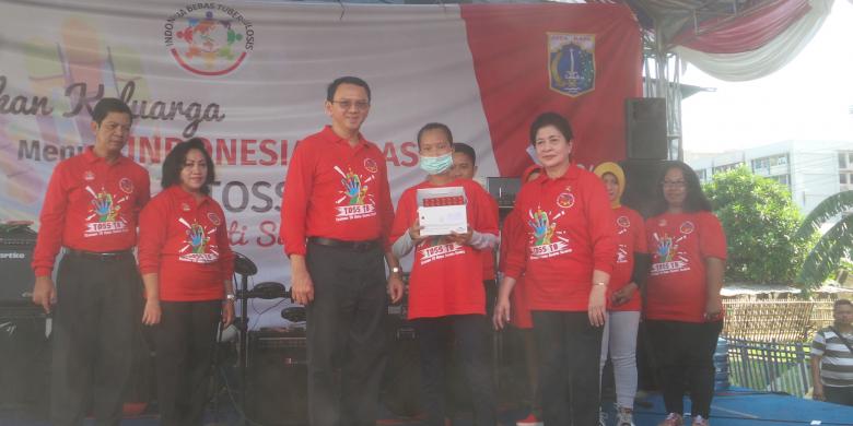 Menteri Kesehatan Nila Moeloek dan Gubernur DKI Jakarta Basuki Tjahaja Purnama saat memberikan obat kepada salah seorang penderita tuberkulosis dalam acara pencanangan program Temukan Obati Sampai Sembuh Tuberkulosis (TOSS TB) di Keluarga dalam rangka peringatan Hari TB Sedunia Tahun 2016, di Rusunawa Marunda, Cilincing, Jakarta Utara, Sabtu (2/4/2016).