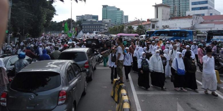 Peserta doa bersama memadati jalanan di sekitar Tugu Tani, Jakarta Pusat, Jumat (2/12/2016).