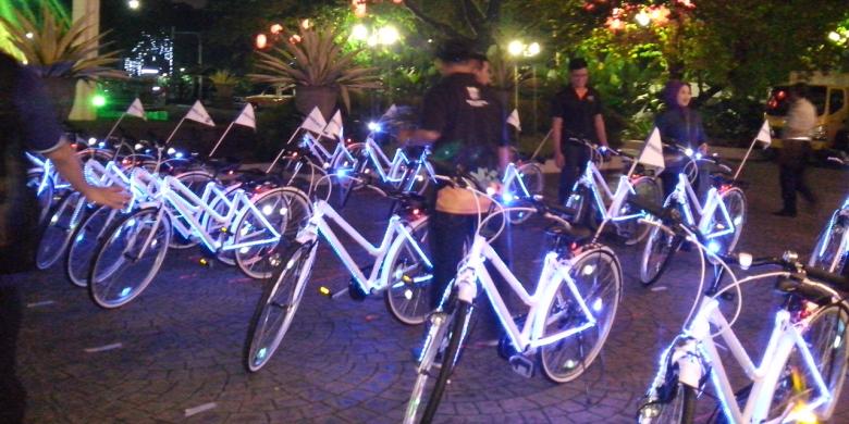 JAKARTA, KOMPAS.com - Ratusan sepeda berhias lampu memeriahkan pembukaan acara perayaan malam muda-mudi atau Jakarta Night Festival (JNF), Sabtu (21/6/2014) malam.