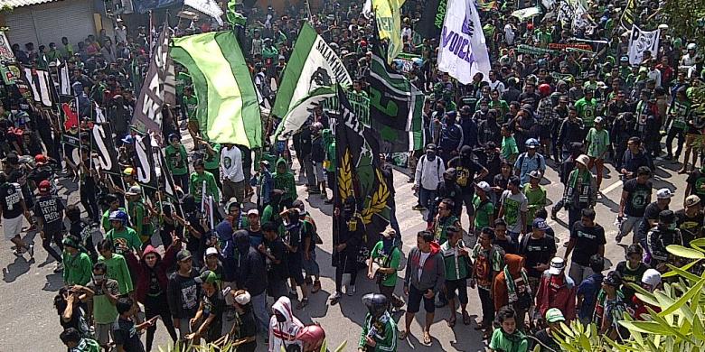 SURABAYA, KOMPAS.com — Keputusan Menpora Imam Nahrawimembekukan PSSI disambut gembira suporter Bonek yang menggelar aksi saat Kongres PSSI berlangsung di Hotel JW Marriot Surabaya, Sabtu (18/4/2015).