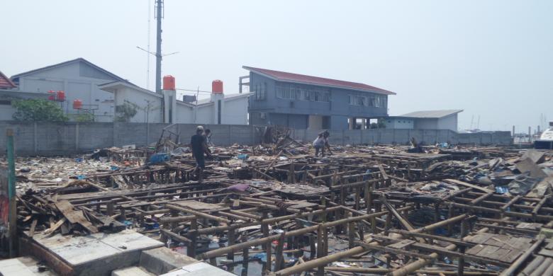 Puluhan rumah semi-permanen di Kampung Baru, Muara Angke, Kecamatan Pluit, Jakarta Utara, telah dibongkar.